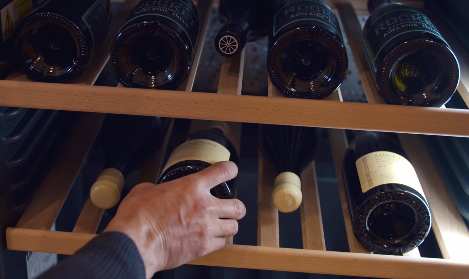 Downer’s personal collection of his own chardonnays as well as those from other growers, stored in his Liebherr wine cabinet.