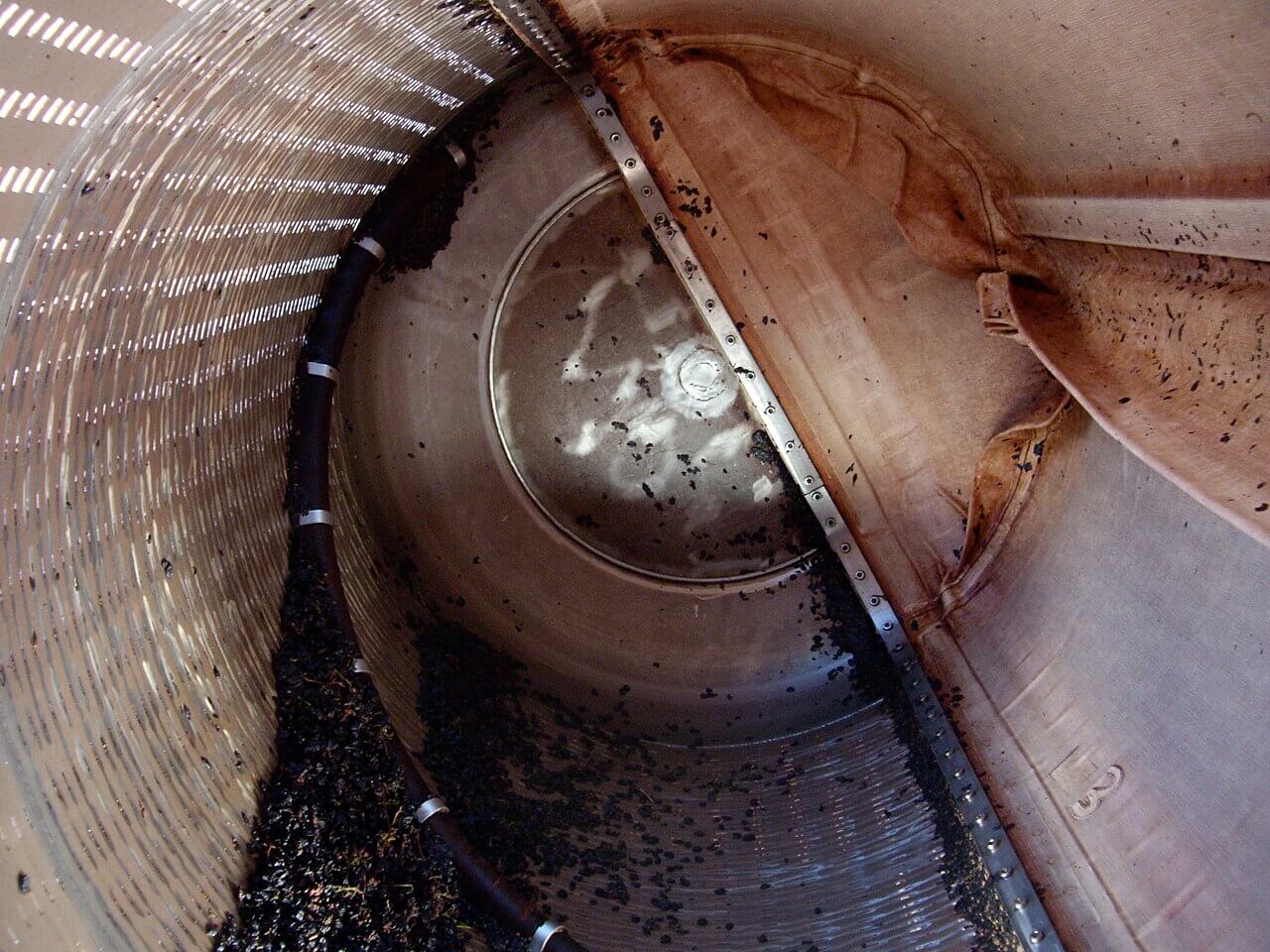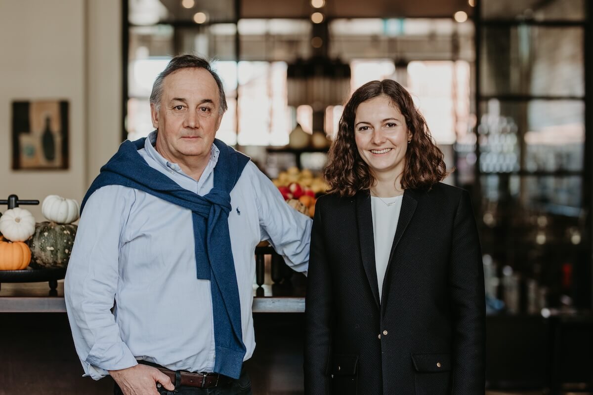 Above: The interior of a modern pneumatic wine press, showing the skins of pinot noir berries, freshly separated from the juice. (Photo by Robert Pitkin, CC BY-SA 2.0.) Opposite: Francis Egly (on left) with his daughter Clémence in Melbourne.