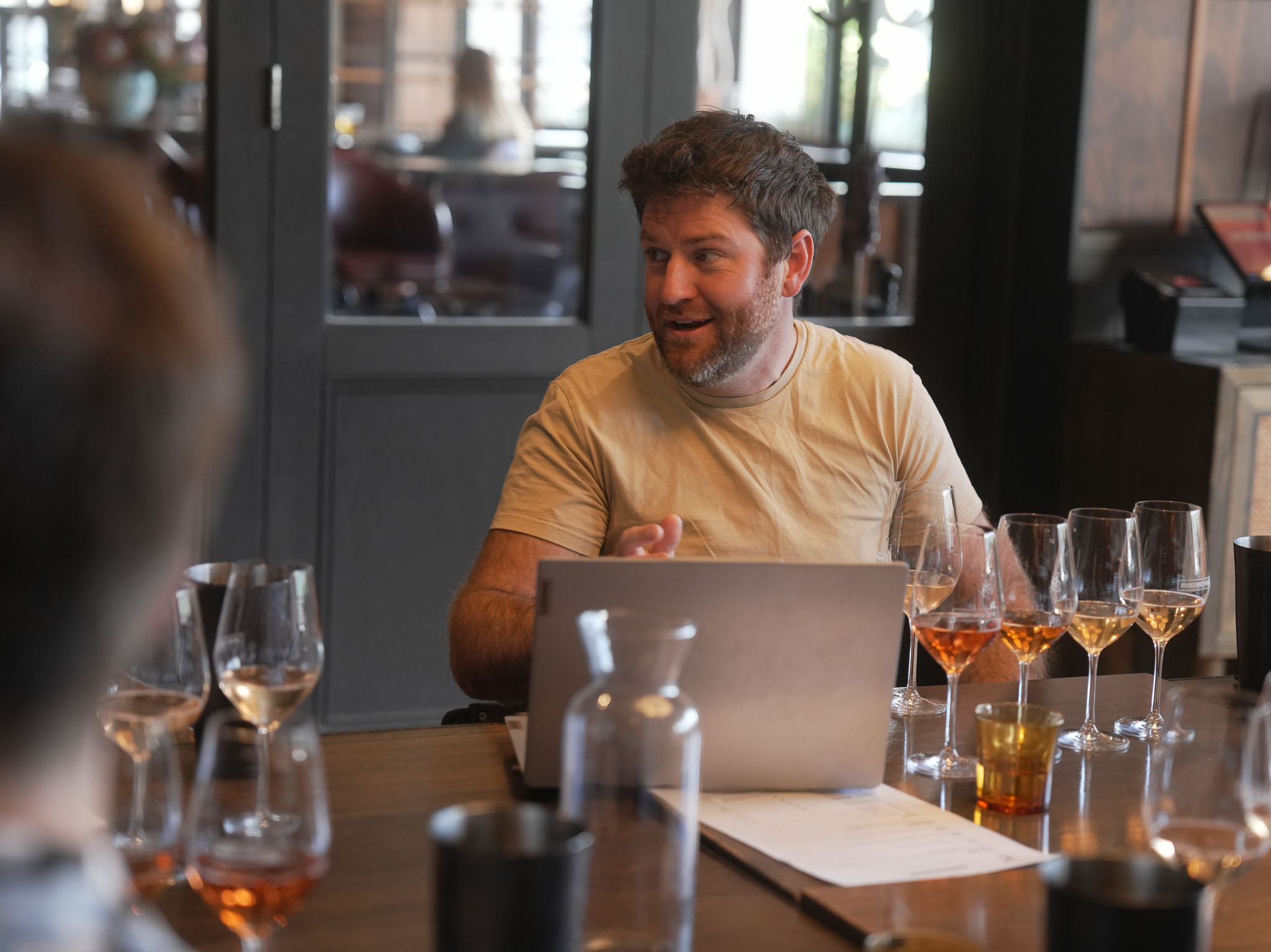 Yeates included this wine among his top six selections from the tasting, describing how he “felt like I was playing Tekken 5 with this one: choose your fighter! First into the ring, the densely packed aromas: a wall of dried and glaceau blood oranges and pithy strawberry tops reign supreme, speckles of myrtle leaf and bitter orange not far behind. The joyous aromas remind me of all the best parts of daytime hangs with mates – a splash here, a splash there, no fuss. Next into the ring, the palate: a welcome dab of briny salinity alongside slippery, wavy bubbles, all tied together neatly with mouth-punching acidity – think crème fraîche on a Samurai sword. With its lashings of Aranciata soda–adjacent flavours, this wine is begging to be paired with a roast Porchetta roll and a drippy celeriac remoulade. Who’s hungry?”