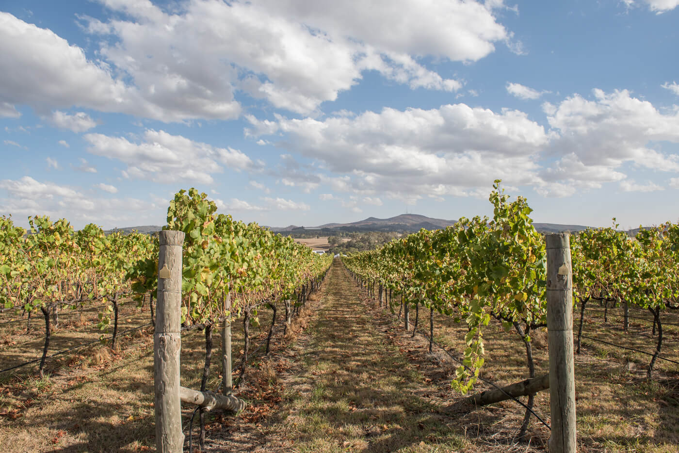 Swinging Bridge’s Hill Park vineyard in Orange, with Mount Conobolas in the background. It snows in these parts in winter.