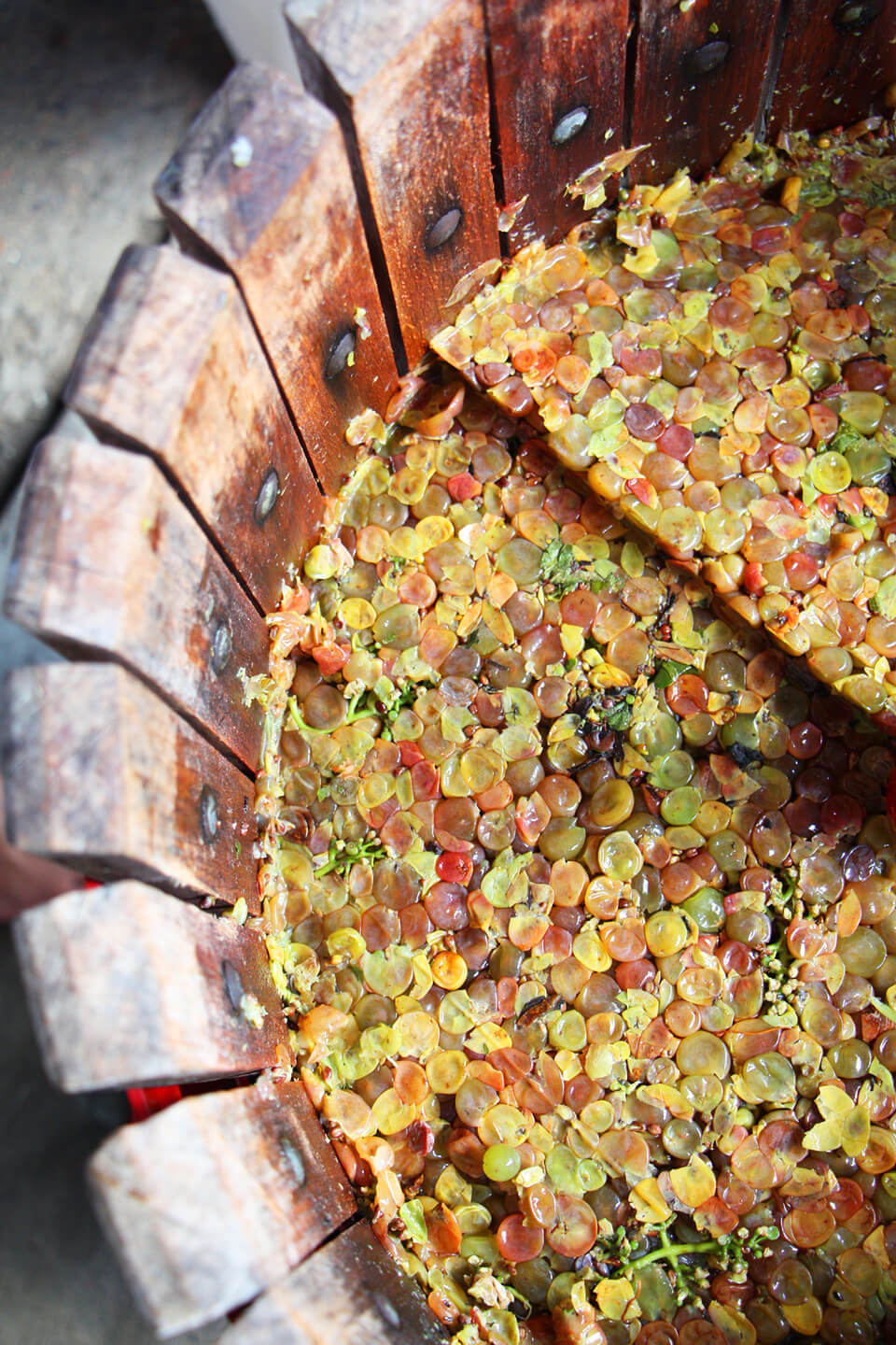 A cake of freshly pressed gewürztraminer skins in a basket press at Dirt Candy, with the pressed juice going into their ‘Renegade’ wine.
