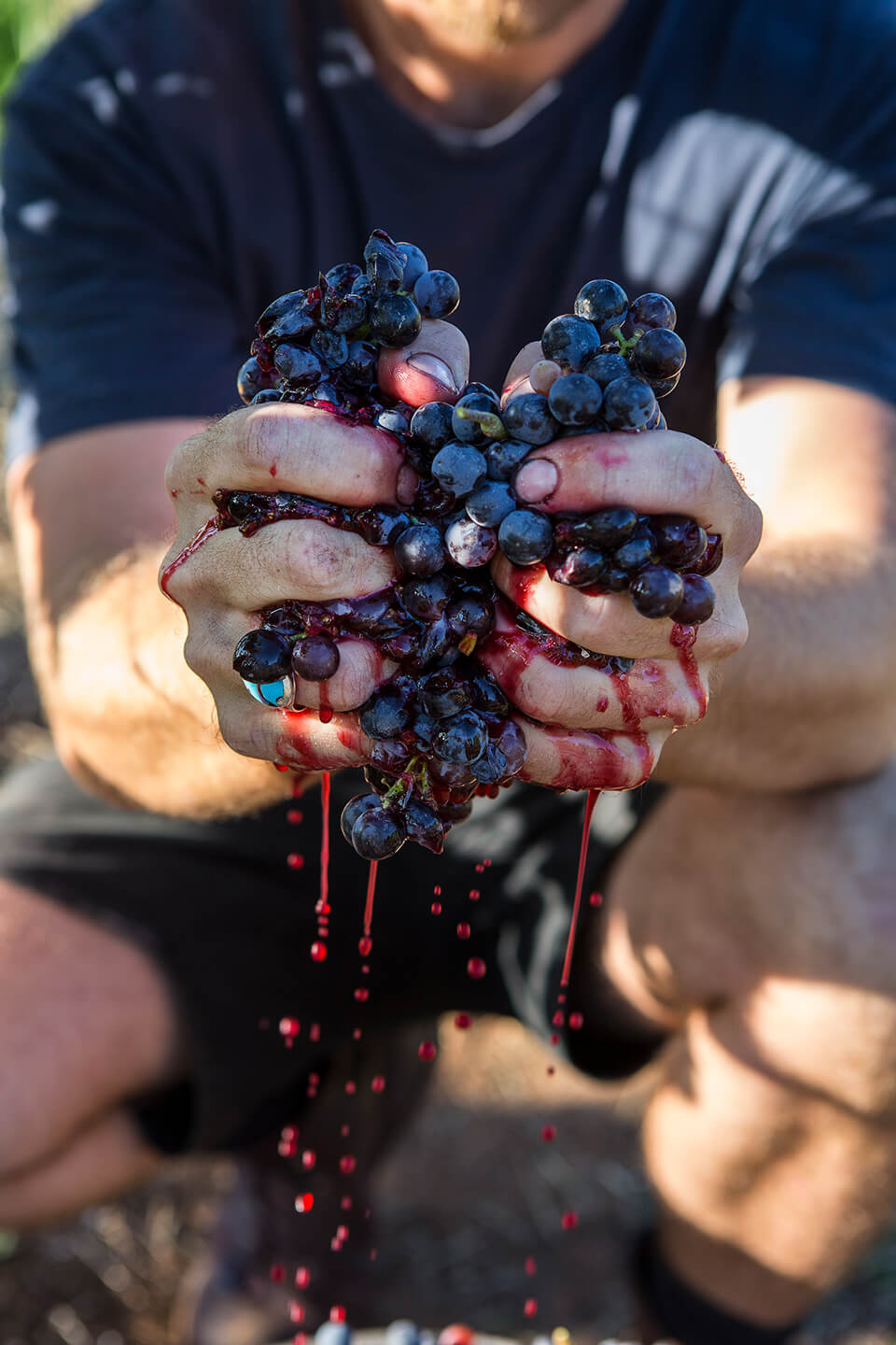 Angus Vinden squeezes some alicante bouschet grapes at harvest – showing that, quite uniquely, the flesh has a red pigment. (Most grapes have clear flesh, with the pigment in wine coming from skins.)