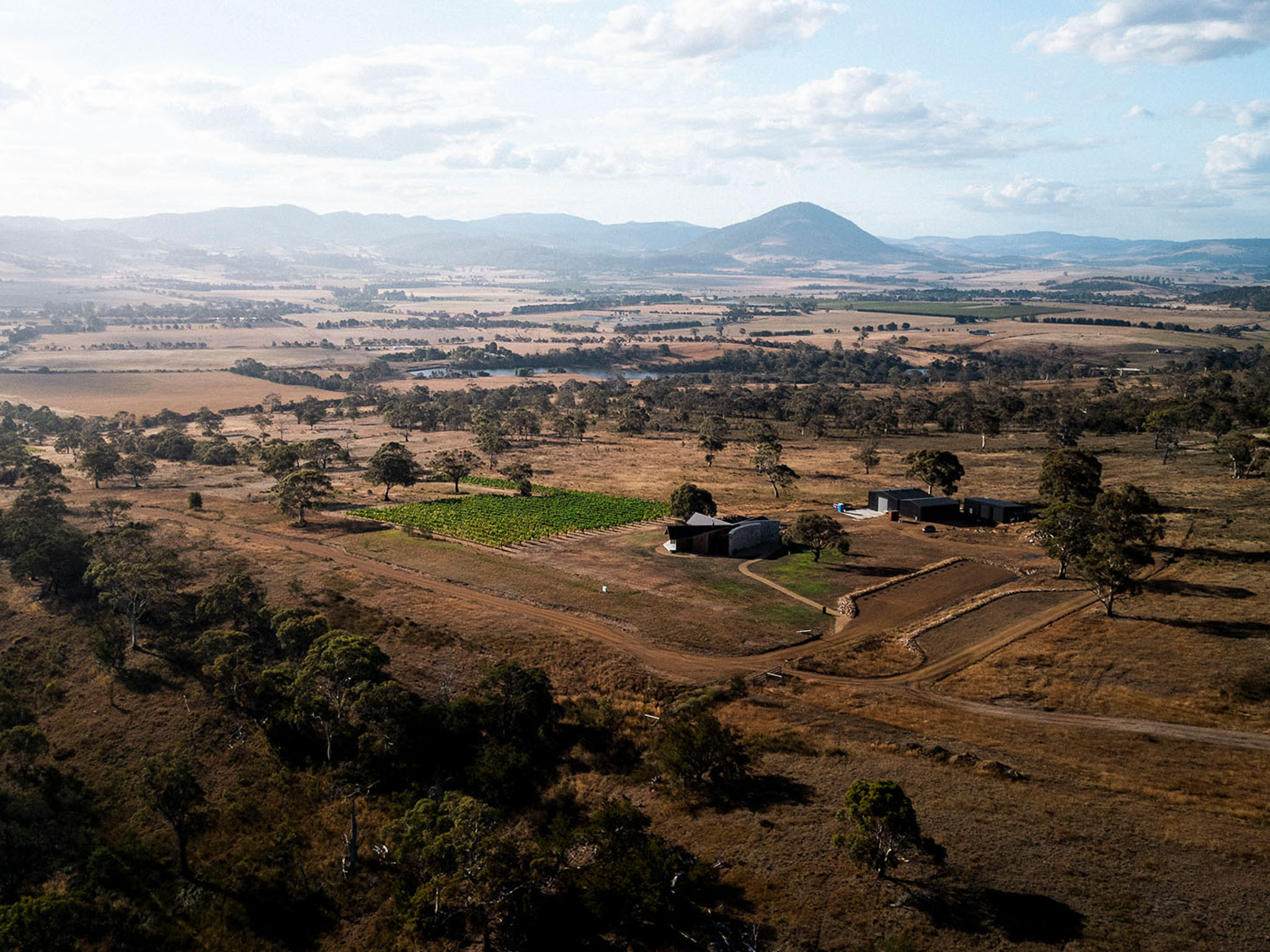 The difference between the site and the broader Coal River Valley floor – where most vineyards sit on alluvial soils – is stark. Most of the valley is farmed on the flats; Caledon is on the hill. The elevation and aspect mean more sunlight hours, better phenolic development and a natural capacity to reach both sugar and phenolic ripeness in balance. The wind, though, is a constant presence. The spring north-westerlies sweep through the valley during flowering and fruit set, acting as a natural yield mitigant and keeping everything in check. “I love leaning into 60km gusts and almost getting bowled over,” Folloso says. “I love how pieces of dolerite keep making their way to the surface and make sure you’re awake in the tractor as you find them with the slasher.” The harshness is not a problem to be managed away; it is part of what the site is. “Some of the greatest wines come from the harshest of environments,” he says. “We’re looking to turn the lower yields and more expressive wines into our favour.”